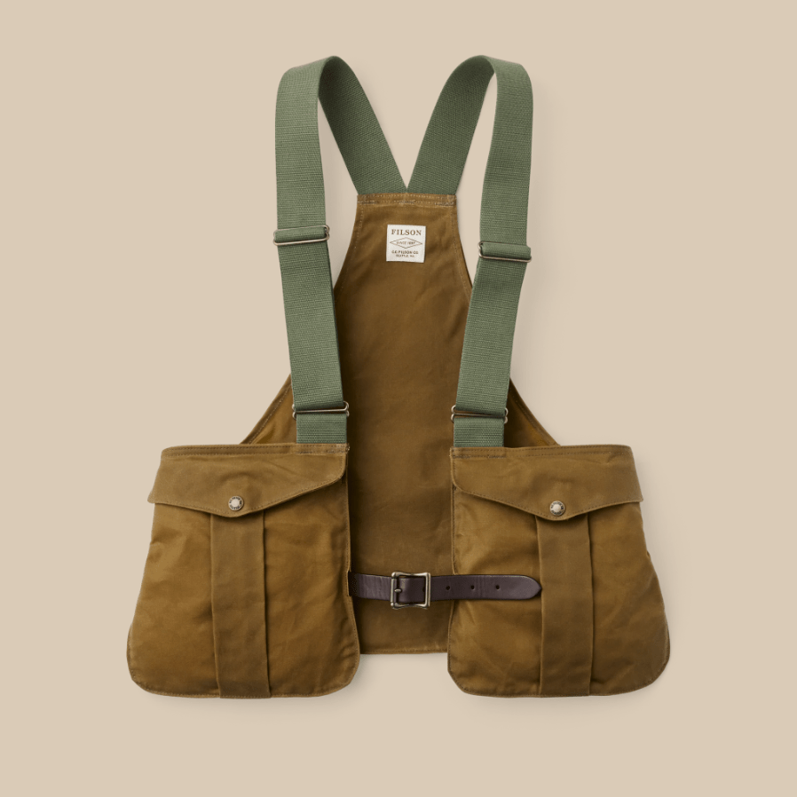Our Tin Game Bag is a durable hunting vest with over three decades of proven service. The rear game bag holds a limit of gamebirds and the expandable shell pockets each have the capacity for a box of shells. This classic hunting vest is engineered to maximize durability and freedom of movement, with adjustable cotton webbing shoulder straps and a Bridle Leather waist closure.