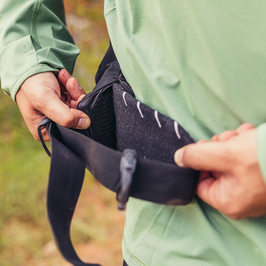 • Perforated, breathable shoulder harness with sternum strap featuring an integrated safety whistle