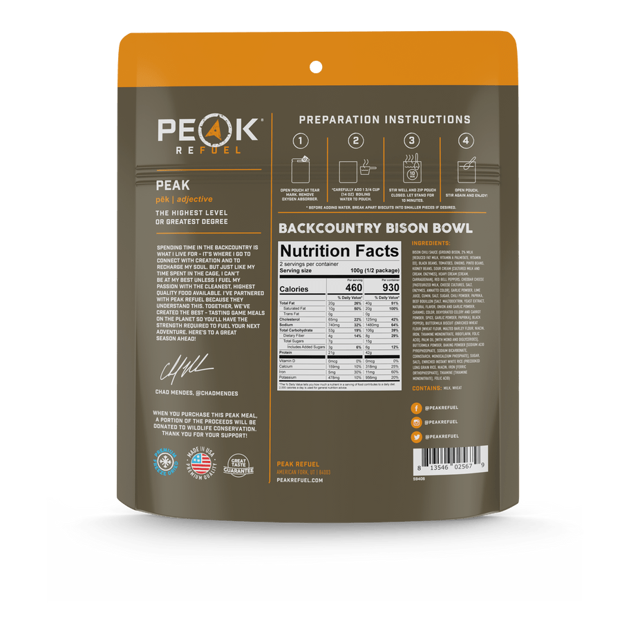 While creating this meal, I knew from the start that it had to have bison in it. Similar to the traditional Navajo taco dish, this meal consists of rice, beans, and bison meat in a delicious, creamy chili sauce. The best part? It also includes two whole buttermilk biscuits. This is a hearty, filling meal that not only has unbeatable taste and flavor, but will keep you full and content in the backcountry! -Chad