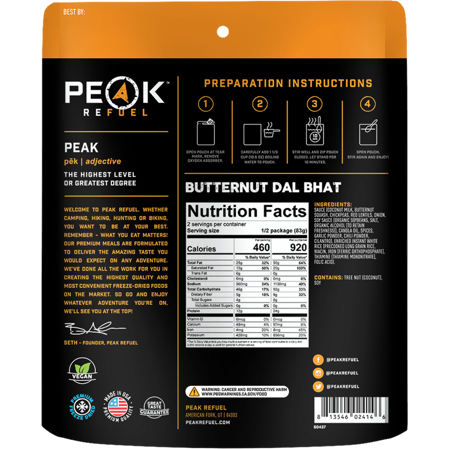 Whether you're stopping for lunch on the trail or getting ready for dinner at your campsite, we guarantee you'll want some Butternut Dal Bhat in your pack. This delicious dish will blow your mind with red lentils, chickpeas, rice, and butternut squash! Oh, and did we mention it's vegan? Just add 1 1/3 cups of boiling water and you're set!