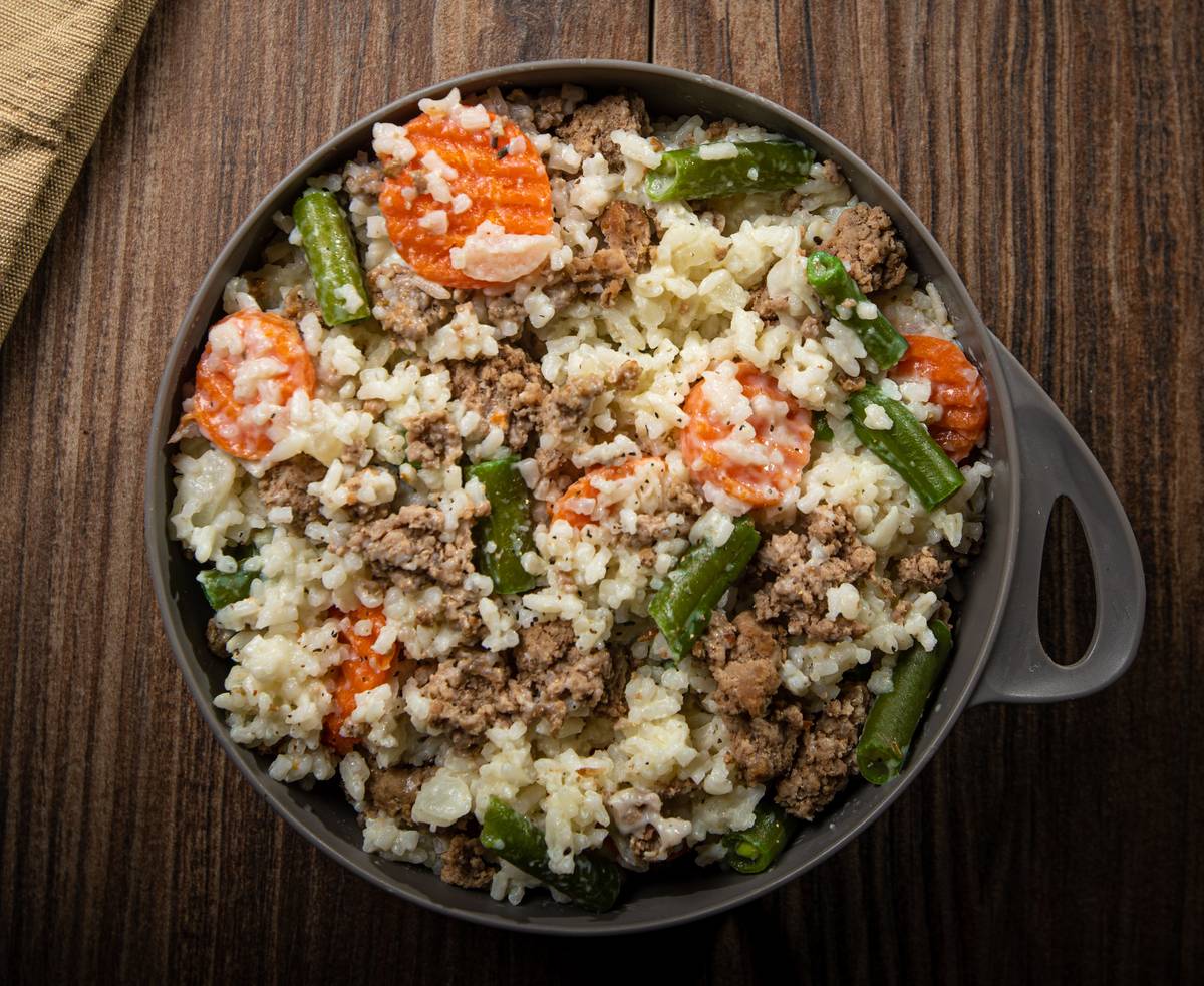 Creamy sauce (ground venison, 2% milk [reduced fat milk, vitamin a palmitate, vitamin D3], heavy cream [cream, carrageen], onion carrots, green beans, canola oil, enriched wheat flour[unbleached wheat flour, niacin, reduced iron, thiamine, mononitrate, riboflavin, folic acid, enzymes], vegetarian chicken bouillon [salt, maltodextrin, natural flavor, yeast extract, onion powder, celery powder, carrot powder, turmeric extract, spice], salt rosemary, black pepper, thyme), enriched instant white rice (precooked long-grain rice, niacin, iron [ferric orthophosphate], thiamine [thiamine mononitrate], folic acid).