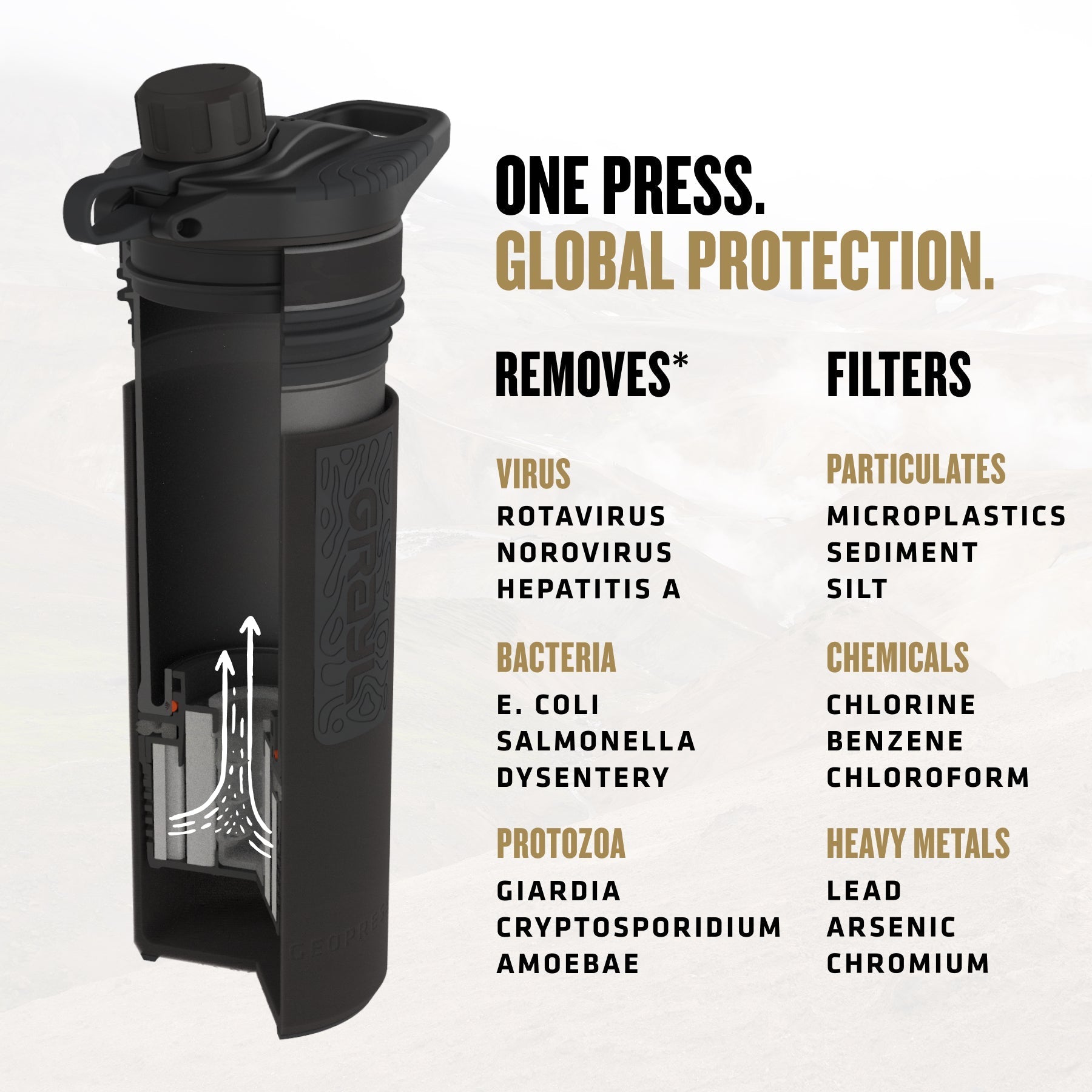 Purify Water. Anywhere. Requires zero setup time and makes 24 fl. oz. of clean drinking water in a blazing fast 8 seconds (5L/min) for quick and simple on-the-go filtration and purification. Make clean drinking water anywhere on earth with unrivaled ease, speed & convenience. Sip or chug, fill a hydration reservoir, or use for backcountry cooking. Removes global waterborne pathogens (VIRUS, bacteria, protozoan cysts) and filters pesticides, chemicals, heavy metals, and microplastics. Also improves taste, smell and clarity.