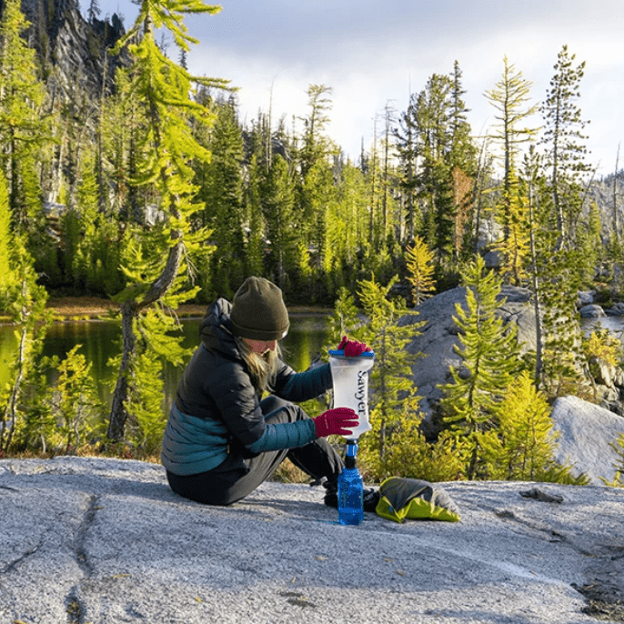 The 0.1 micron absolute hollow-fiber membrane filter removes 99.99999% of bacteria (e.g., salmonella, cholera, E. coli), 99.9999% of protozoa (like giardia and cryptosporidium), and 100% of microplastics. Paired with a durable, BPA-free, FDA-approved 2-liter TPU bladder with a wide mouth for easy filling, this system is both effective and convenient. The reusable Sawyer Squeeze Filter lasts up to 100,000 gallons, with thick fiber walls that enable rigorous backwashing. Weighing under 6 ounces, the system includes a cleaning coupling and plunger. Every Sawyer Filter is triple-tested for safety and can function as a squeeze filter or in a gravity setup.