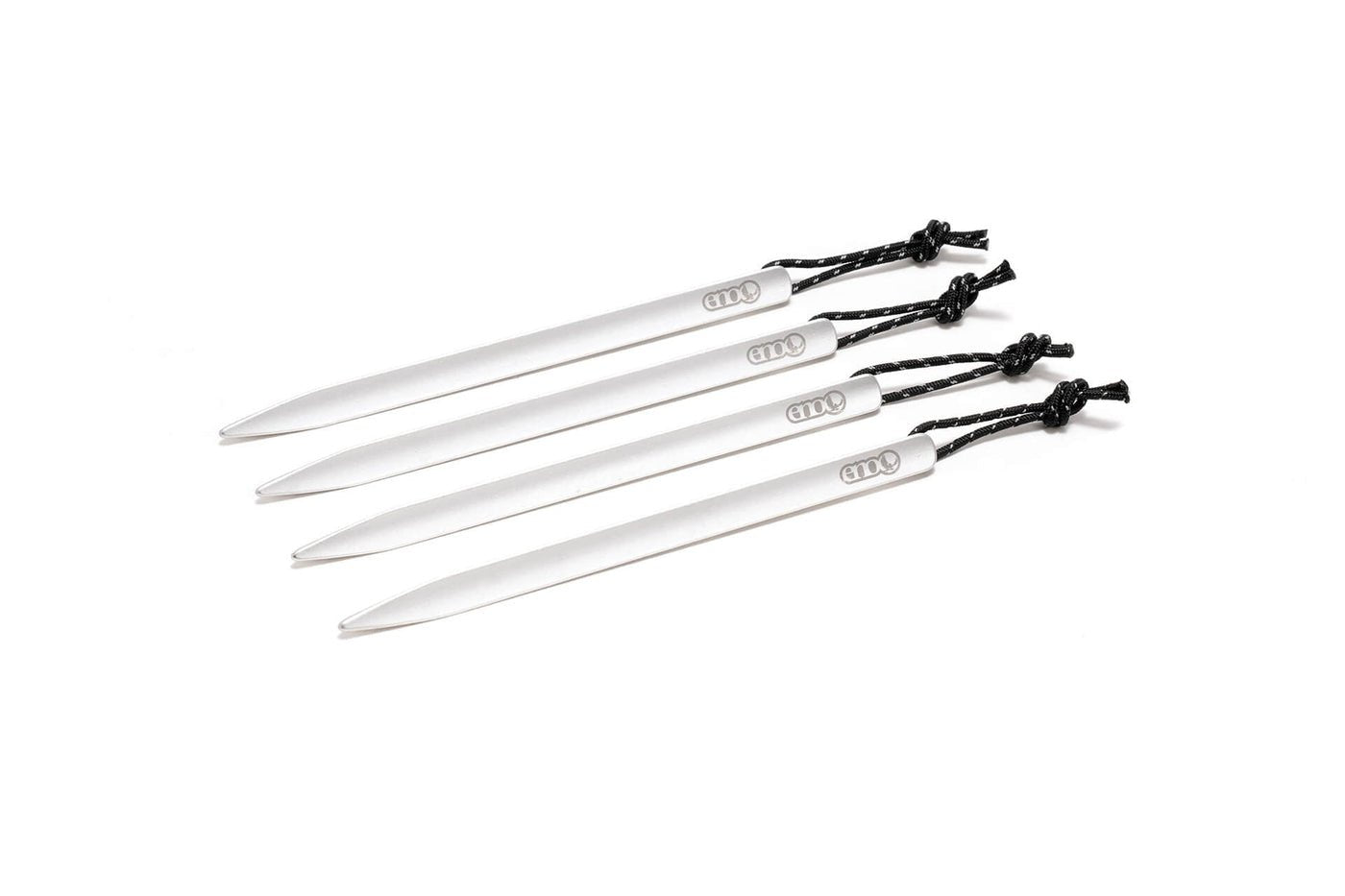 Custom lightweight ENO aluminum stakes come with pre-tied loop knots for easy removal.