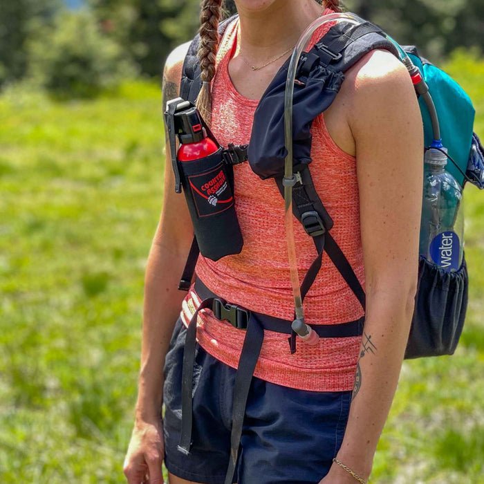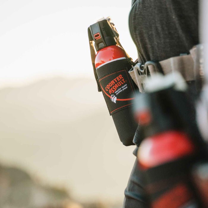 The only 40 foot bear spray, the 10.2 oz. Bear Deterrent includes a Belt Holster and reaches farther and lasts longer than other bear sprays on the market. This powerful 40-foot bear spray sprays for 8 seconds and is designed to deter a bear attack with a powerful, atomized blast of concentrated pepper spray. The included sturdy nylon belt holster attaches easily to belts and packs.