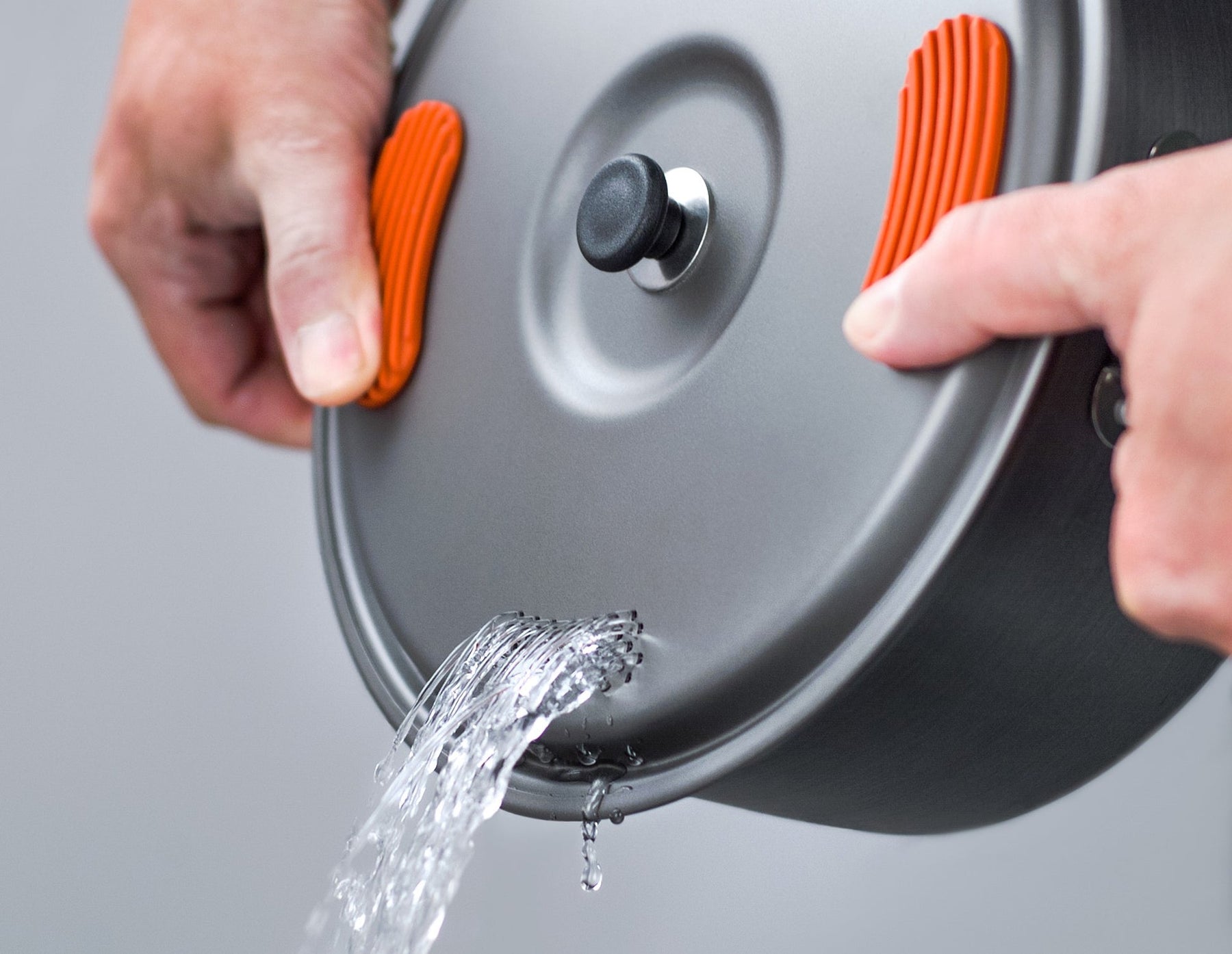 Halulite hard anodized aluminum provides superior conductivity to titanium while still being incredibly light meaning that this 3.2 liter pot cooks more efficiently so you can go farther and carry less fuel. The integrated silicone thumb pads on lid make straining pasta safe and secure.