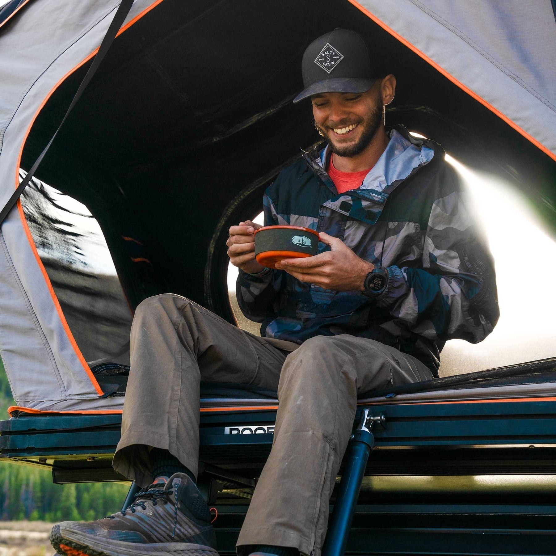 Folding handle locks into place for cooking and secures entire set for transport. Unique nesting bowl + mug solution with low center of gravity and sip-it lid virtually eliminate spills while the insulating sleeve keeps drinks hot.