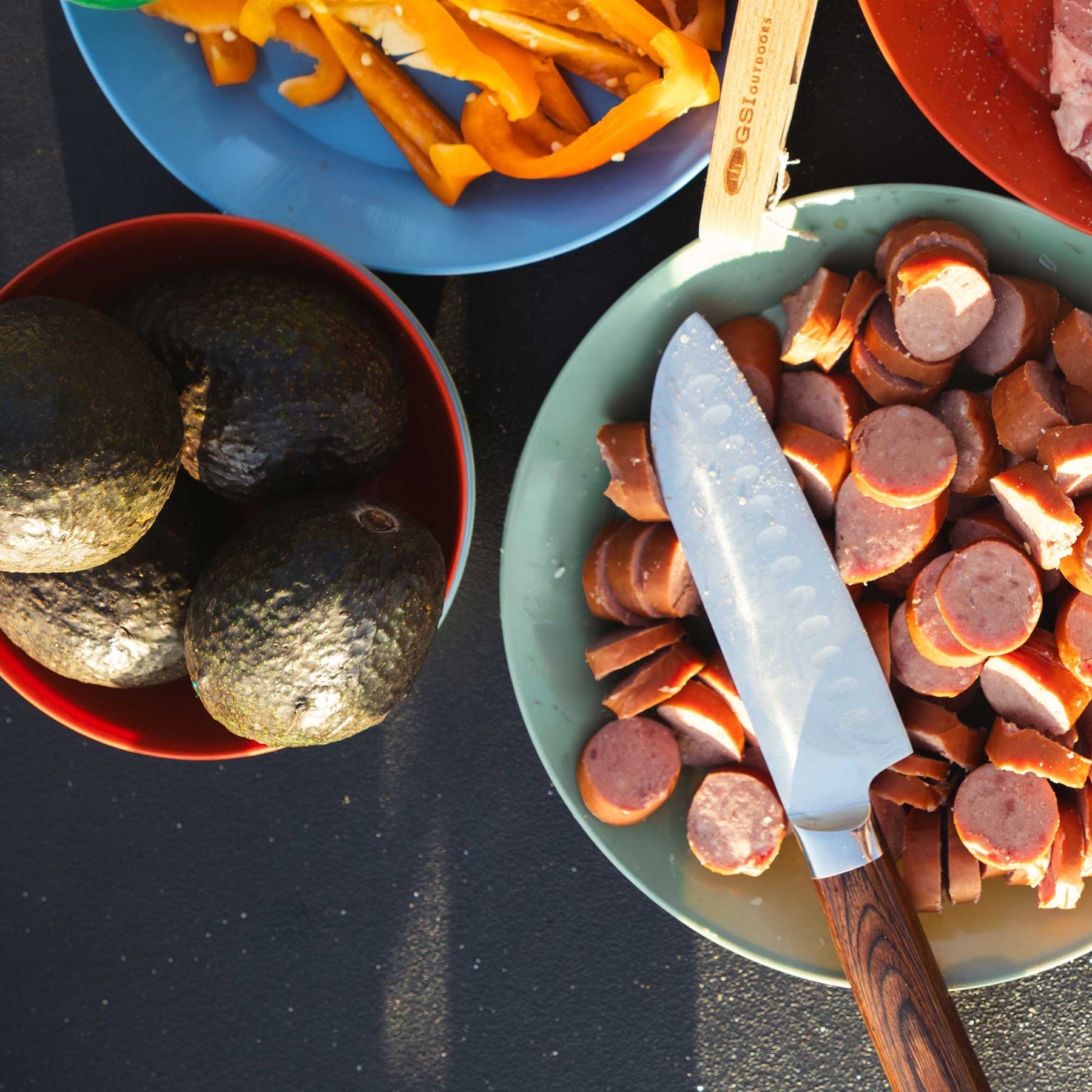 6" Santoku Chef's Knife with ECO reclaimed laminate wood handle. Includes a durable recycled polypropylene sheath.