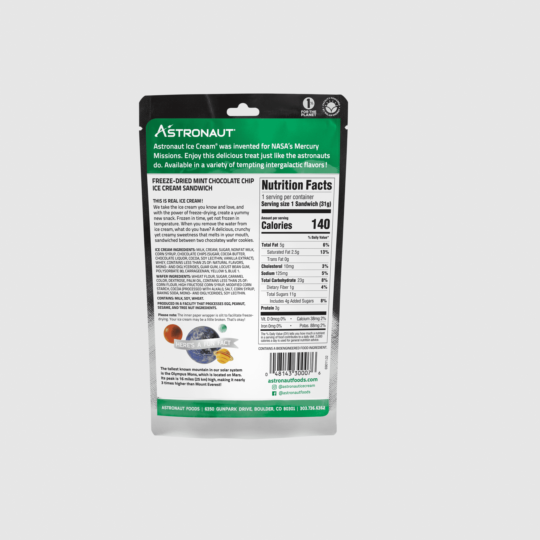 Treat yourself to a trip to the stars with these freeze-dried ice cream sandwiches! Delectably crunchy, yet creamy mint chocolate chip ice cream is sandwiched between two crunchy chocolate-flavored wafers for a treat that's out of this world.