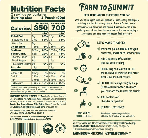 Ingredients: Egg Noodle (Durum Wheat Flour and Egg), Whole Milk, Yellow Cheddar Cheese (Milk, Salt, Cheese Cultures and Enzymes, Whey, Buttermilk, Salt, Disodium Phosphate, Annatto Extract), Tomato, Fire-Roasted Green Chile, Butter (Sweet Cream, Salt, Nonfat Milk), Paprika, Salt, Black Pepper.