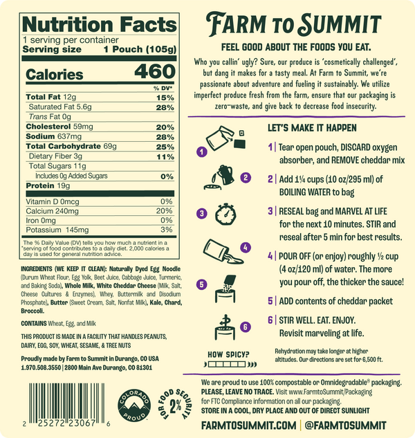 Ingredients: Naturally Dyed Egg Noodle (Durum Wheat Flour, Egg Yolk, Beet Juice, Cabbage Juice, Turmeric, and Baking Soda), Whole Milk, White Cheddar Cheese (Milk, Salt, Cheese Cultures & Enzymes, Whey, Buttermilk and Disodium Phosphate), Butter (Sweet Cream, Salt, Nonfat Milk), Kale, Chard, Broccoli.