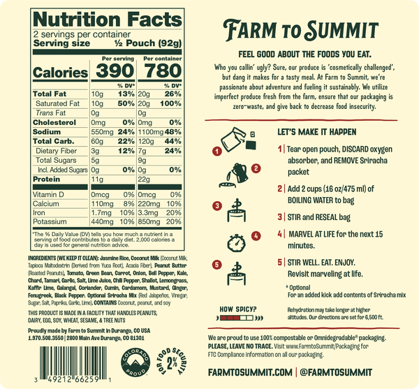 Ingredients: Jasmine Rice, Coconut Milk (Coconut Milk, Tapioca Maltodextrin (Derived from Yuca Root), Acacia Fiber), Peanut Butter (Roasted Peanuts), Tomato, Green Bean, Carrot, Onion, Bell Pepper, Kale, Chard, Tamari, Garlic, Salt, Lime Juice, Chili Pepper, Shallot, Lemongrass, Kaffir Lime, Galangal, Coriander, Cumin, Cardamom, Mustard, Ginger, Fenugreek, Black Pepper.