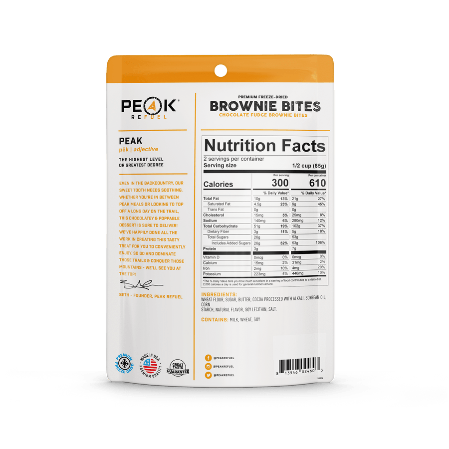 It's time to up your dessert game in the backcountry. Have you ever been able to pack a brownie on a hike? Now you can! With two servings and a resealable pouch, there's no need to worry about your dessert melting or getting crushed - just pop a few in your mouth and feed your sweet tooth with the best trail dessert on the market.