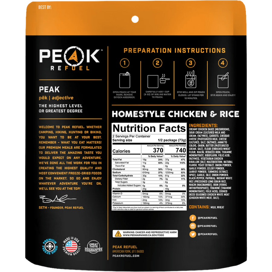 After a long day of following your compass, settle down with a homestyle dish with rice, real white chicken, carrots, and creamy sauce. Now how do we do that? By only using premium, freeze-dried, all natural ingredients that keep their shape, taste, and nutritional value. Giving you 40 grams of protein, 15% of your daily iron, and 30% of your daily calcium, just add 1 cup of water and restore your energy and get ready for the next stage of your adventure.