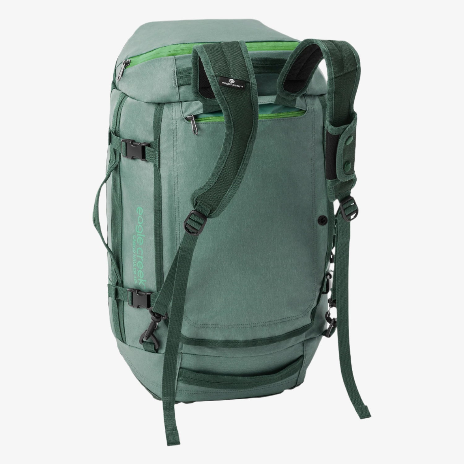 Carry-on duffel that converts to a backpack, made from recycled, water-resistant fabrics, with padded base & lockable zip.