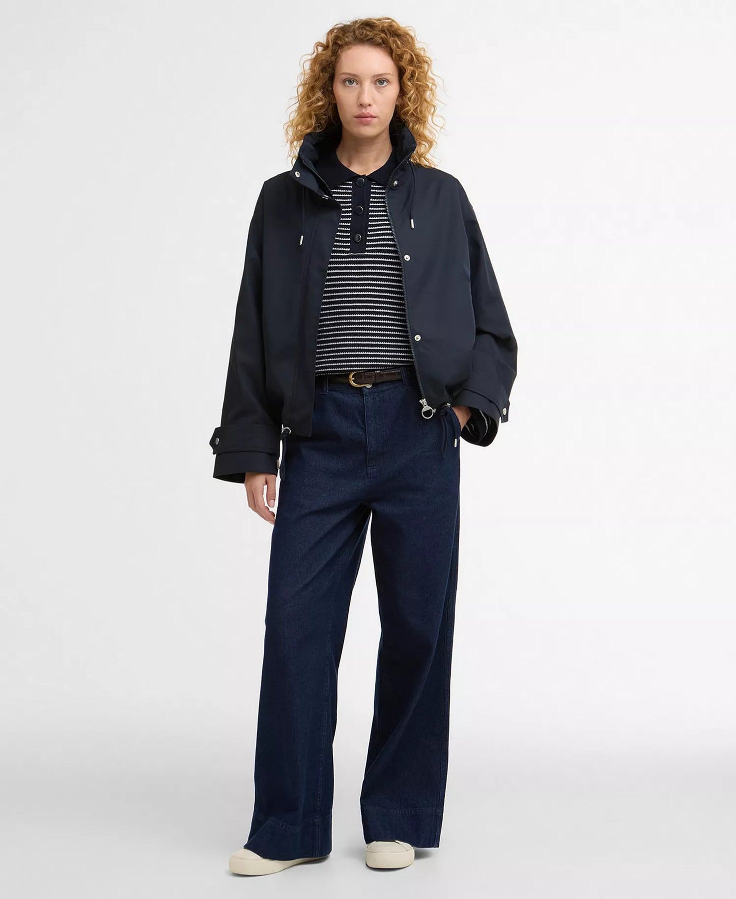 New short showerproof style with an oversized funnel neck with drawcord detail to neck and hem. Zip center front fastening, behind studded placket and welt pockets to front.